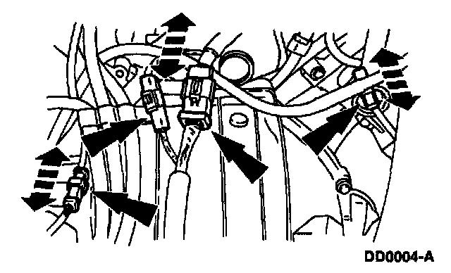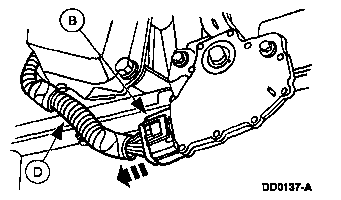 Disconnect the harness connectors at the (A) Vehicle Speed Sensor (VSS), the (B) digital Transmission Range (TR) sensor, the (C) solenoid body and TSS. Position the (D) harness aside.