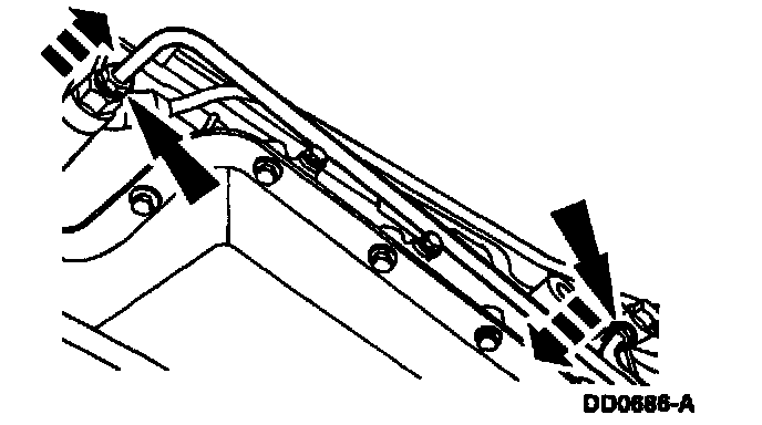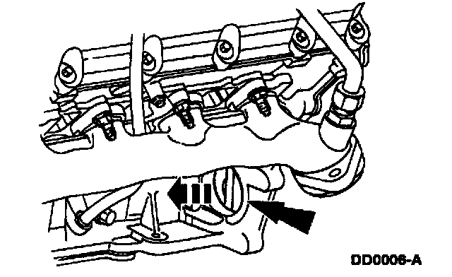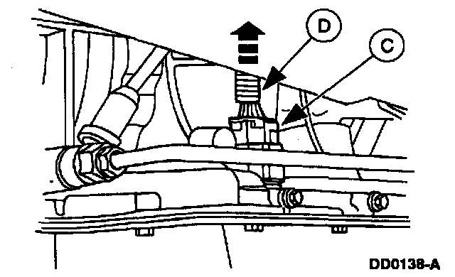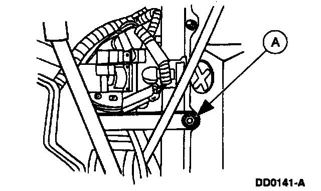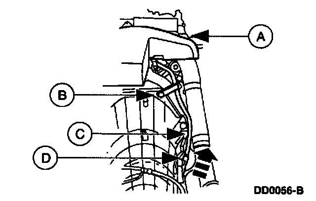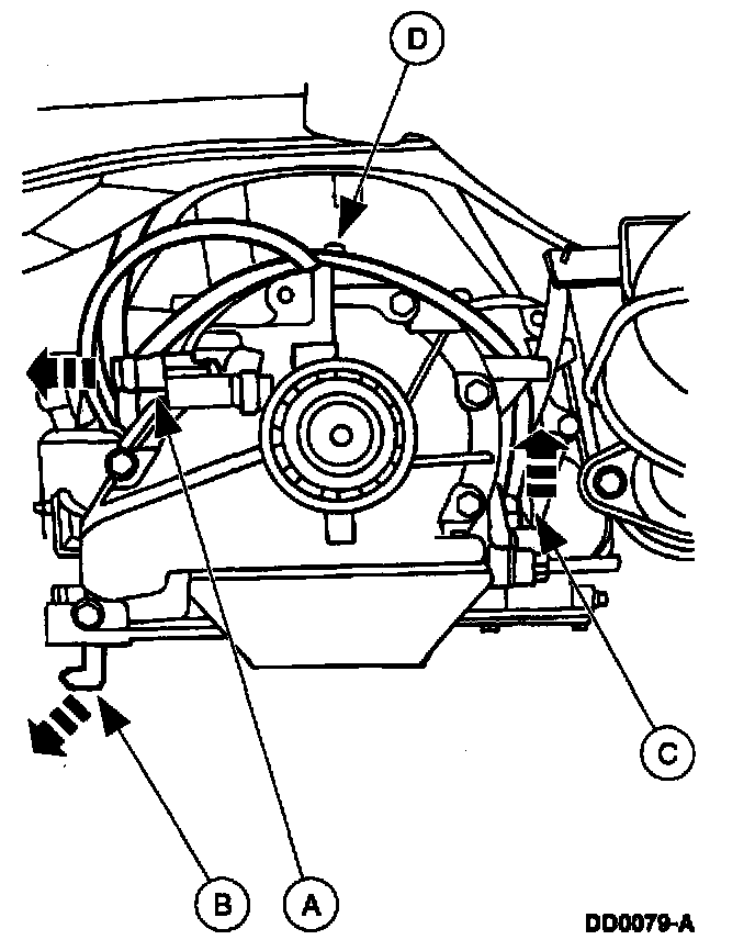 Remove the (A) nut and the (B) bolt. With a suitable drain pan properly positioned, separate the (C) fluid filler tube from the (D) short fluid inlet tube, and secure it aside.