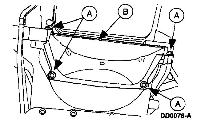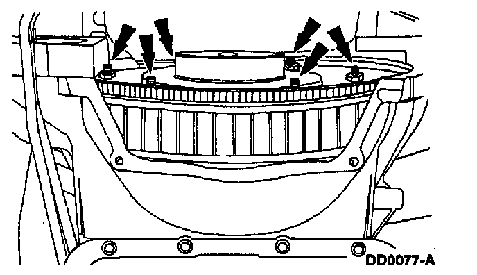 38. Remove the 5 (A) bolts and the (B) flexplate inspection cover.