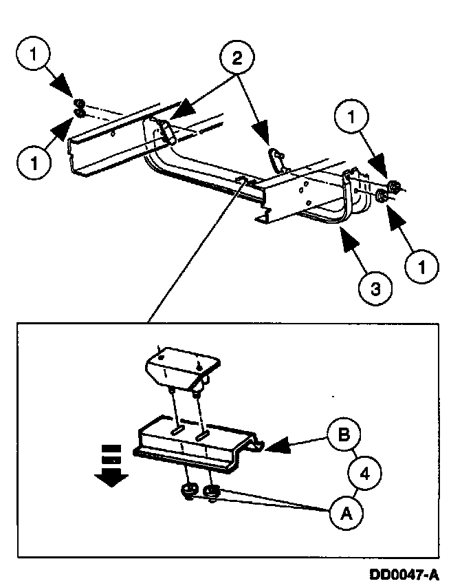 4 Remove the (A) nuts and the (B) transmission support crossmember.