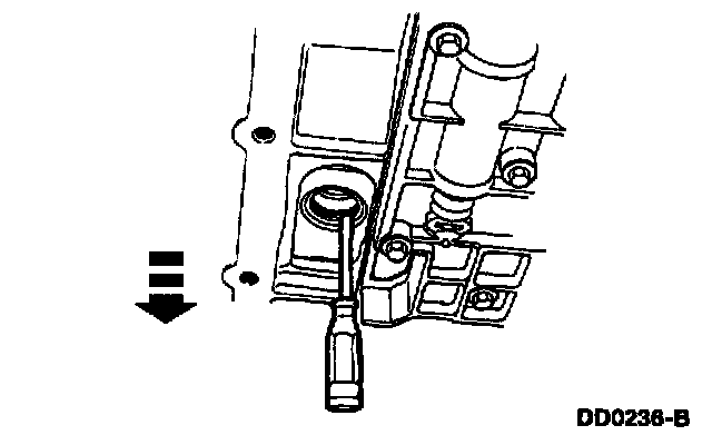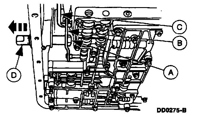 Remove the (A) nut, the (B) inner manual valve detent lever, the (C) parking pawl actuating rod and the (D) manual control lever shaft assembly.