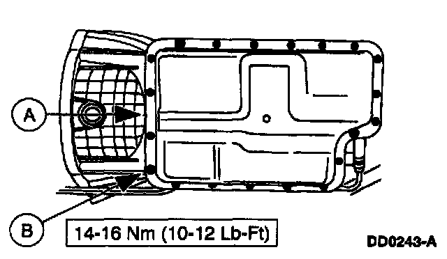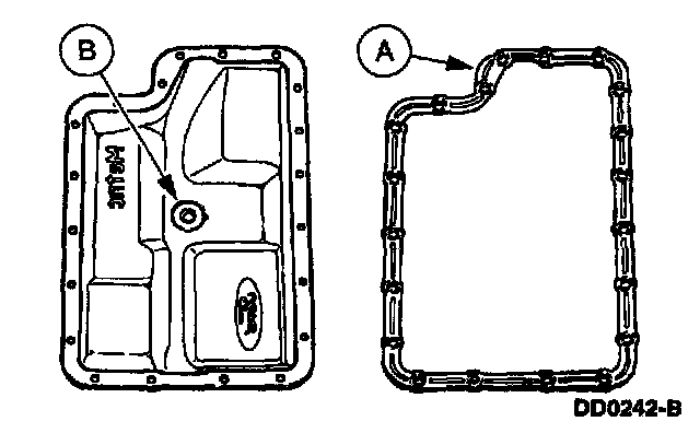 Position the (A) gasket onto the cleaned fluid pan. Make sure the (B) magnet is positioned over the dimple in the fluid pan.