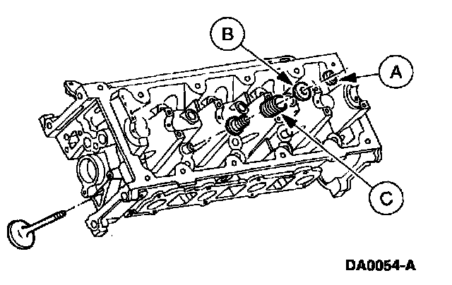 5. Remove the (A) valve spring retainer keys, the (B) valve spring retainers, and the (C) valve spring.