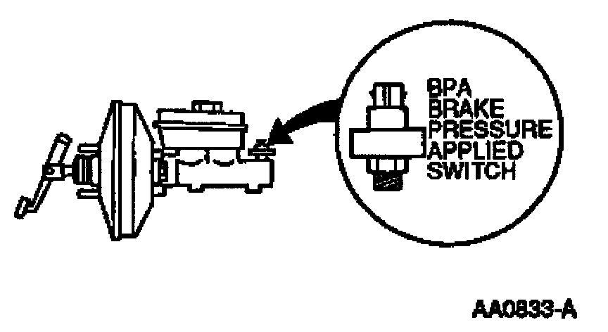 The Brake Pressure Applied switch is a hydraulically-actuated pressure switch that senses brake pressure and provides a back-up to the stoplight switch to deactivate speed control. The switch is totally independent (mechanically and electrically) from the brake lamp switch. The Brake Pressure Applied switch actuates after the Stoplight switch actuates. When the brake pedal is depressed, the switch is open. When the brake pedal is released, the switch is closed. The Brake Pressure Applied switch is located on the brake master cylinder.