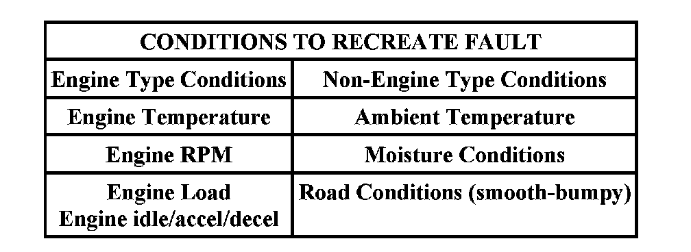 Recreating the fault is the first step in isolating the cause of the intermittent symptom. If Freeze Frame Data is available, it may help in recreating the conditions at the time of a Malfunction Indicator Lamp Diagnostic Trouble Code (MIL-type DTC). Listed below are some of the conditions for recreating the fault.