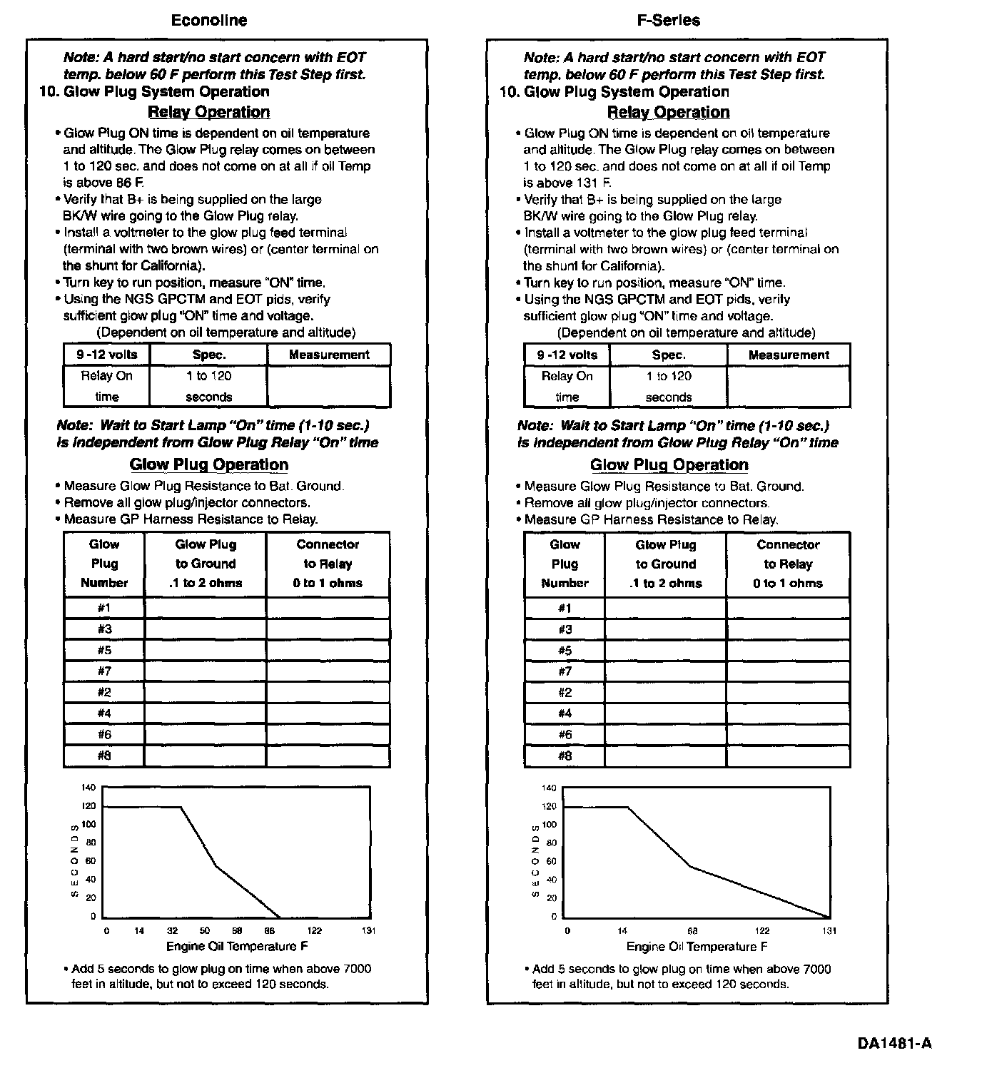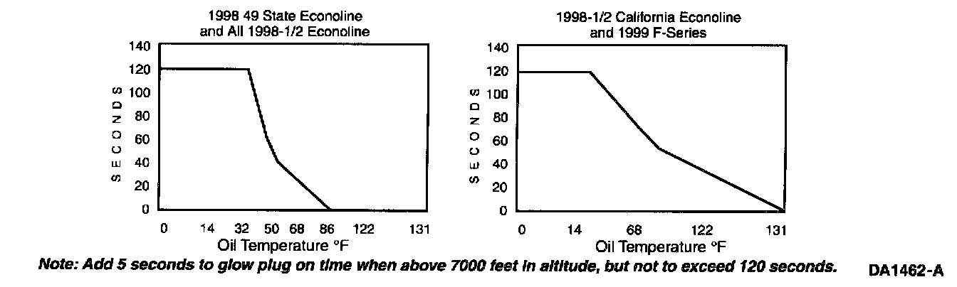 Install a digital multimeter on the glow plug feed side of the glow plug relay (large stud with two wires connected). Turn the ignition key to the ON position but do not attempt to start. Note the time in seconds from when the key is turned on and the glow plug relay energizes until the glow plug relay de-energizes. The relay does not come on if EOT is above 55°C (131 °F) for F-Series and 30°C (86 °F) for Econoline. The glow plug relay makes a loud click noise which is easily heard when it energizes and de-energizes. Compare the times measured to the table (time will be affected by engine temperature, battery condition and vehicle altitude). The voltage at the glow plug feed terminal may vary from 9 to 12 volts depending upon battery condition.