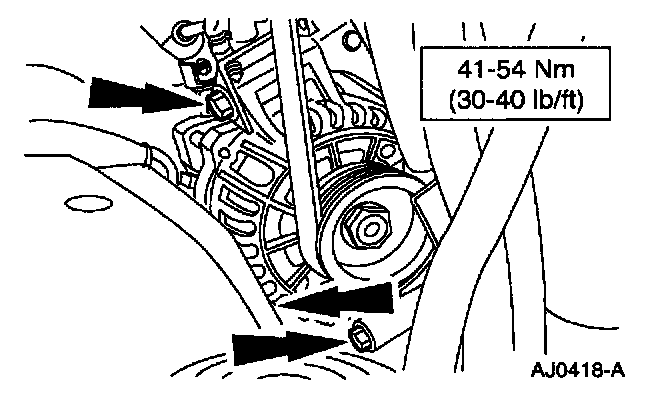 8. Remove the three bolts from the lower generator and partially remove generator by pulling generator out slightly and then down. Once generator is partially removed, disconnect the positive battery cable from the back of the generator and remove the generator.