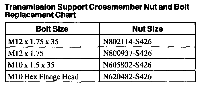 Transmission Support Crossmember Nut And Bolt Replacement Chart:
