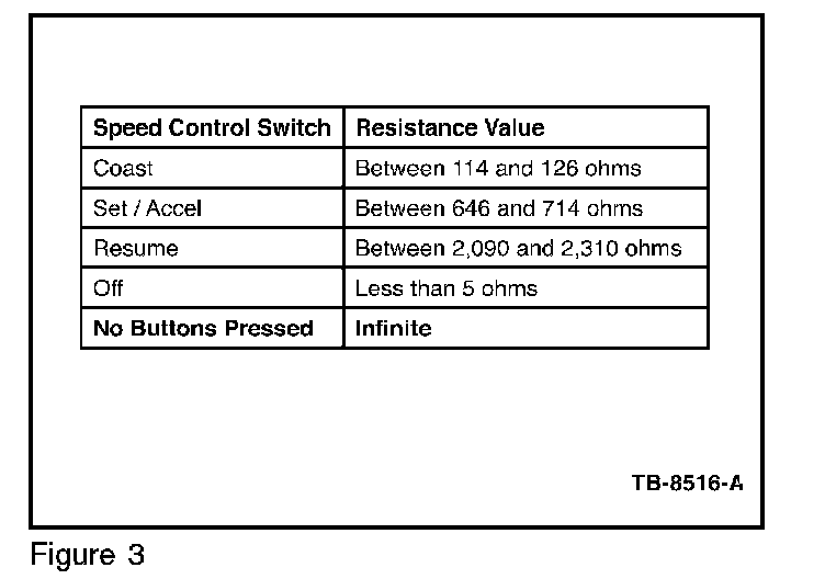 An alternate to the voltage drop test would be to disconnect the switch connector and measure the switch resistance. It should be less than 5 ohms. If the switch is suspected, a bypass test may also be done: On the harness side of the BPS connector, connect a jumper between the two deactivation switch pins and drive vehicle above 30 MPH (48 Km/h). If speed control engages then the brake deactivation switch was faulty, otherwise wiring is at fault.