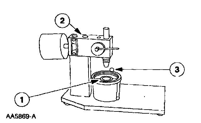 2. Place the (1) hydraulic valve tappet in a (2) commercially available hydraulic tappet leakdown tester. Position the (3) steel ball provided in the plunger cap. Add testing fluid to cover the hydraulic valve tappet and compress hydraulic tappet leakdown tester until the hydraulic valve tappet is filled with testing fluid.