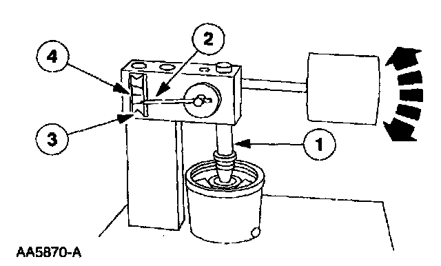3. Adjust the length of the (1) ram so the (2) pointer is just below the (3) Start Timing mark when the ram contacts the hydraulic valve tappet. Start timing as the pointer passes the (3) Start Timing mark and end timing as the pointer reaches the (4) center mark.