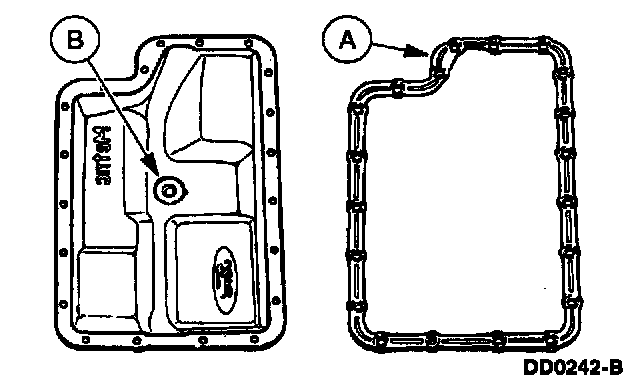 - Position the (A) gasket onto the cleaned fluid pan. Make sure the (B) magnet is positioned over the dimple in the fluid pan.
