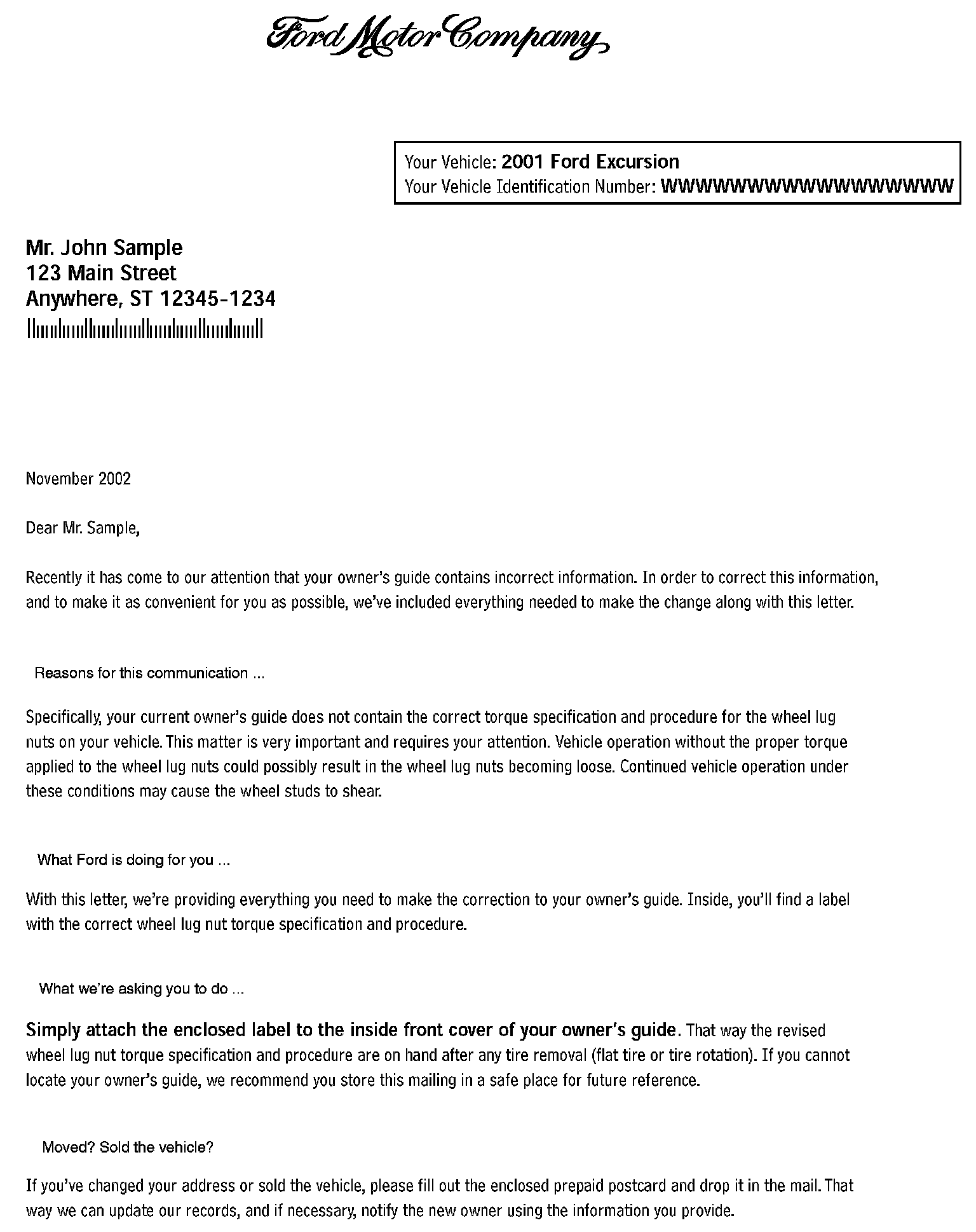 Owner Letter - 2001 Ford Excursion