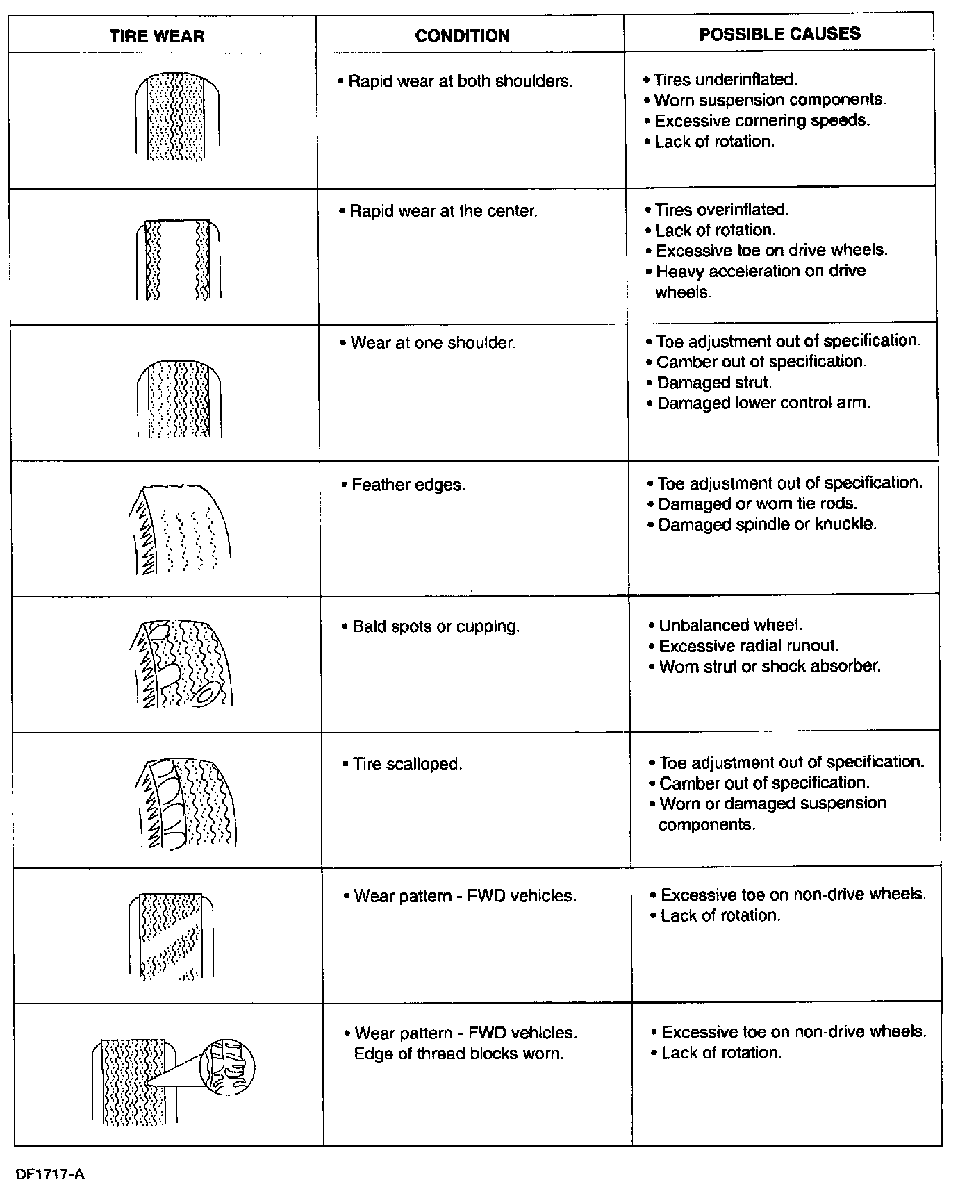 Careful attention must be paid to the tire and wheels. There are several symptoms that can be caused by damaged or worn tire and wheels. Carry out a careful visual inspection of the tires and wheel assemblies. Spin the tires slowly and watch for signs of lateral or radial runout. Refer to the tire wear chart to determine the tire wear conditions and actions.