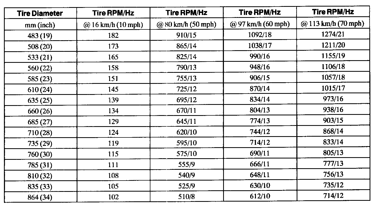 - Obtain the corresponding tire and wheel rpm and frequency from the Tire Speed and Frequency Chart.
