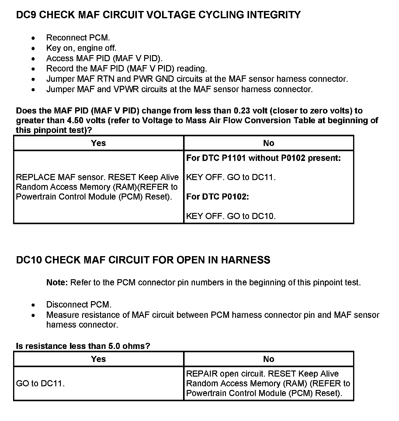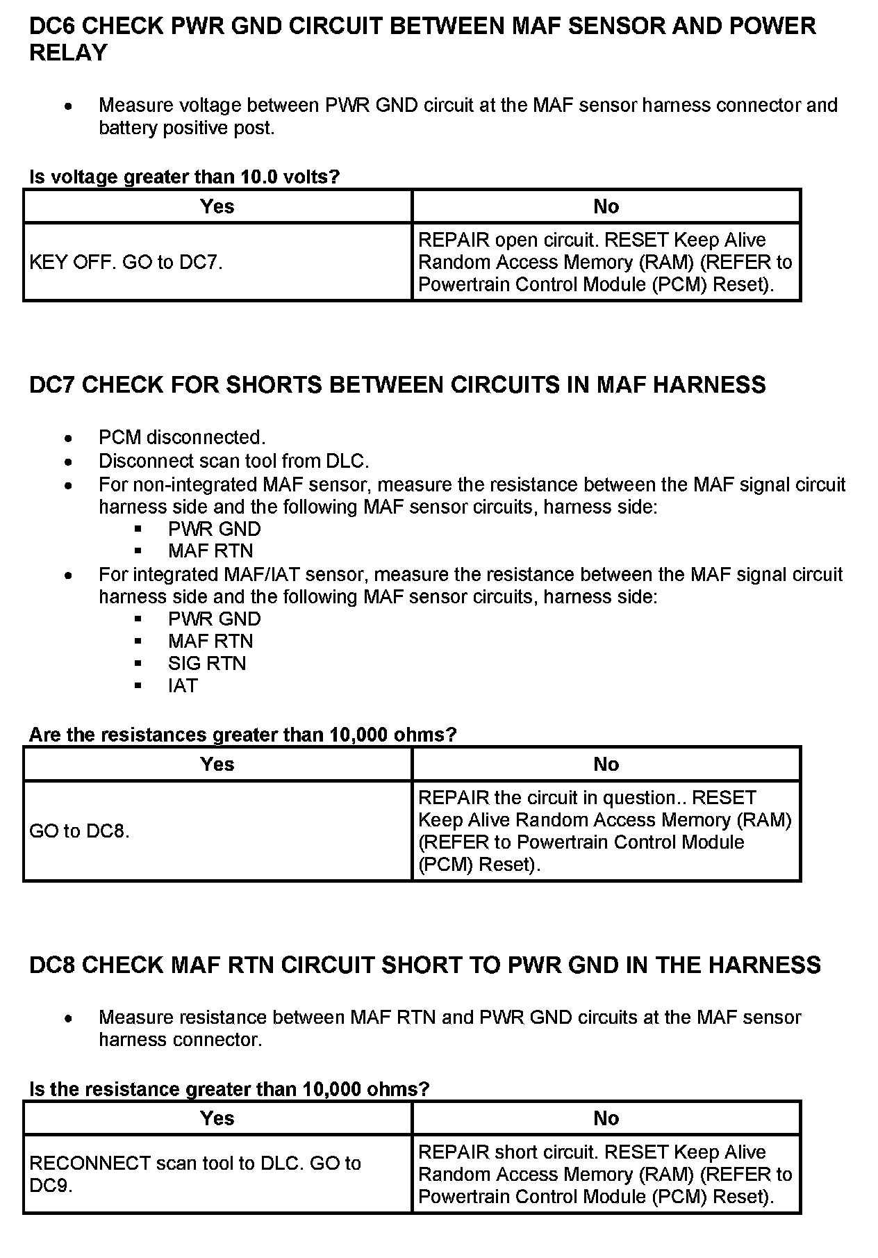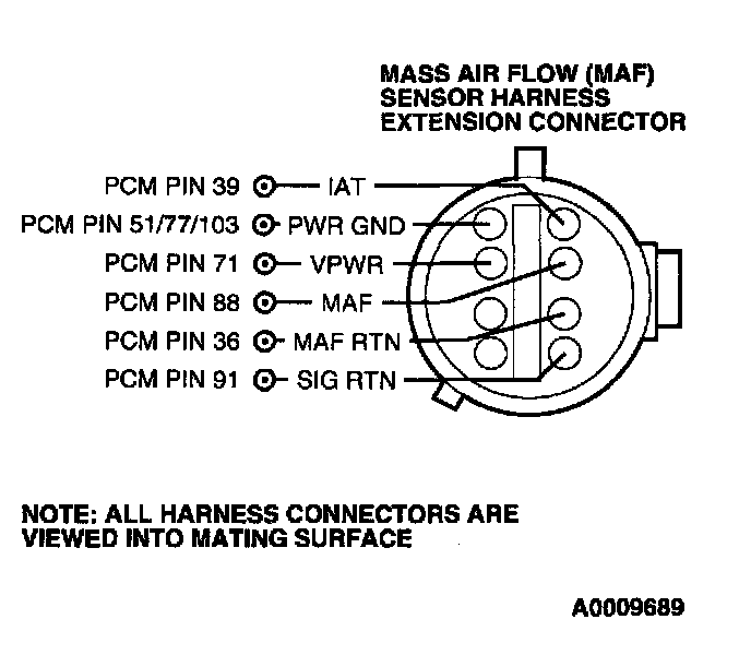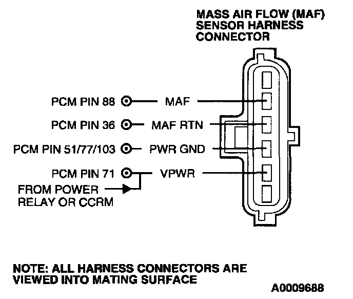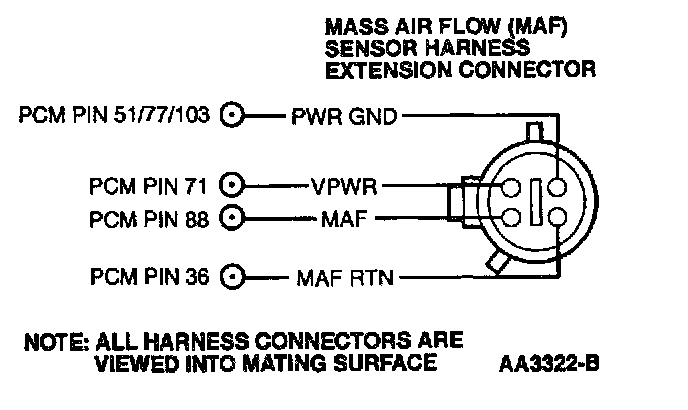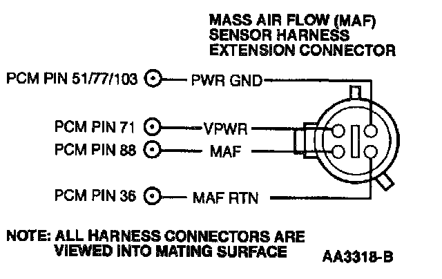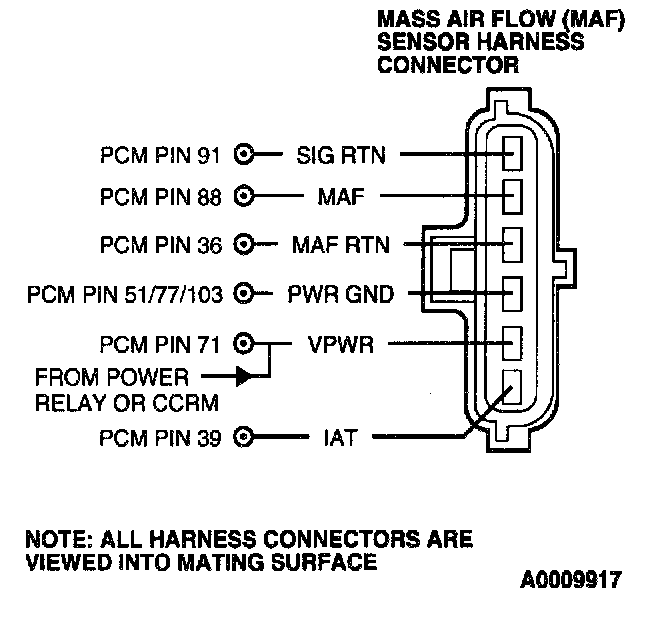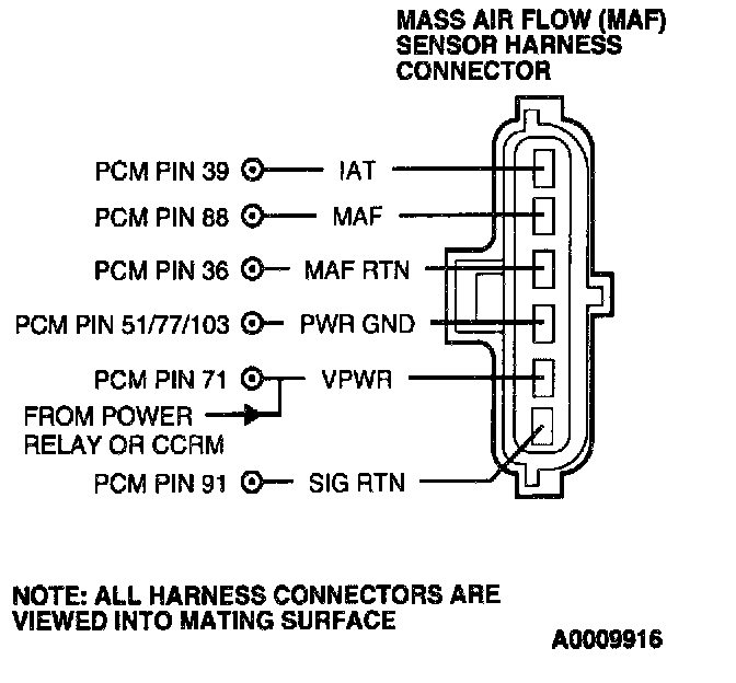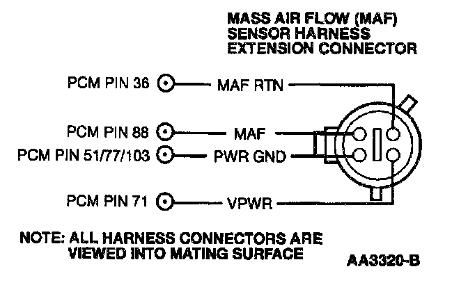 - Harness Circuits: MAF SIG, MAF RTN, Vehicle Power (VPWR), Power Ground (PWR GND), IAT and SIG RTN