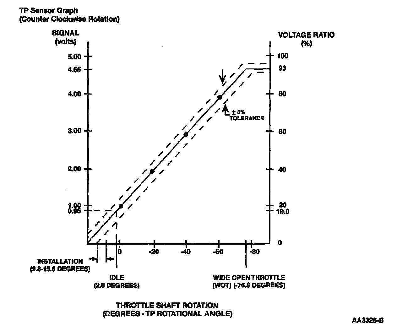 NOTE: The normal range of the throttle angle measurement for the Throttle Position (TP) sensor is 0 to 96.6 degrees.