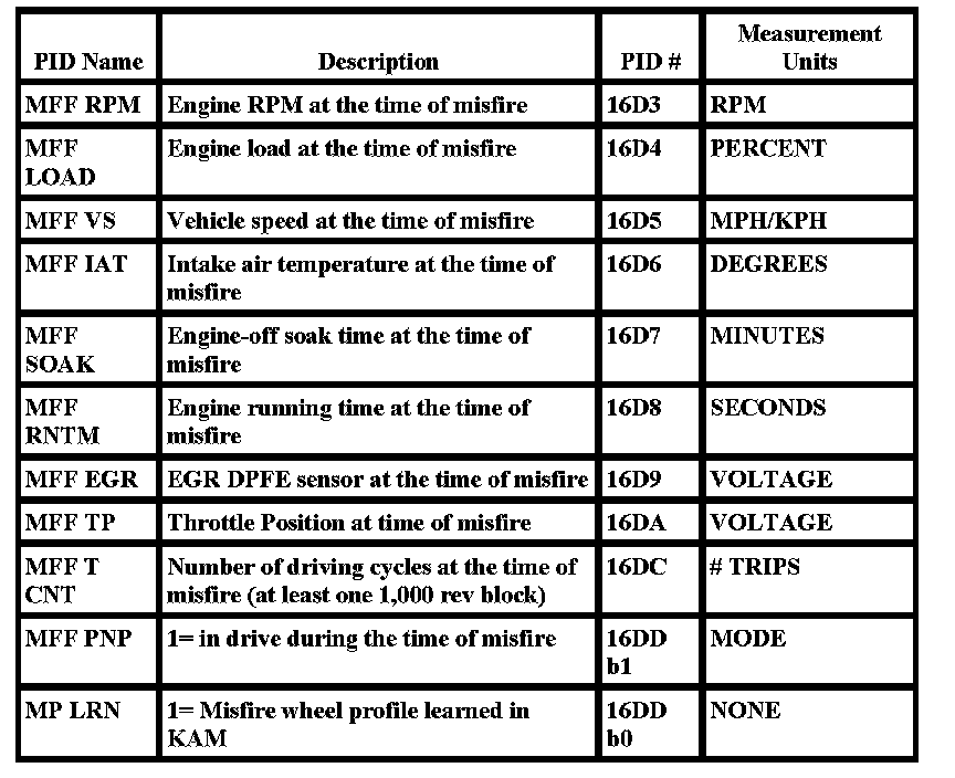 Some unique parameters (PIDs) are stored in the Keep Alive Memory of the PCM to help in diagnosing the root cause of misfires. These PIDs are collectively called misfire freeze-frame (MFF) data. These parameters are separate from the generic freeze-frame data that is stored for every MIL code. They are used for misfire diagnosis only. The MFF data is more useful for misfire diagnosis than the normal diagnosis only. It is captured at the time of the highest misfire rate and not when the DTC is stored at the end of a 1000 or 200 revolution block. (Generic freeze-frame data for misfire can be stored minutes after the misfire actually occurred.)