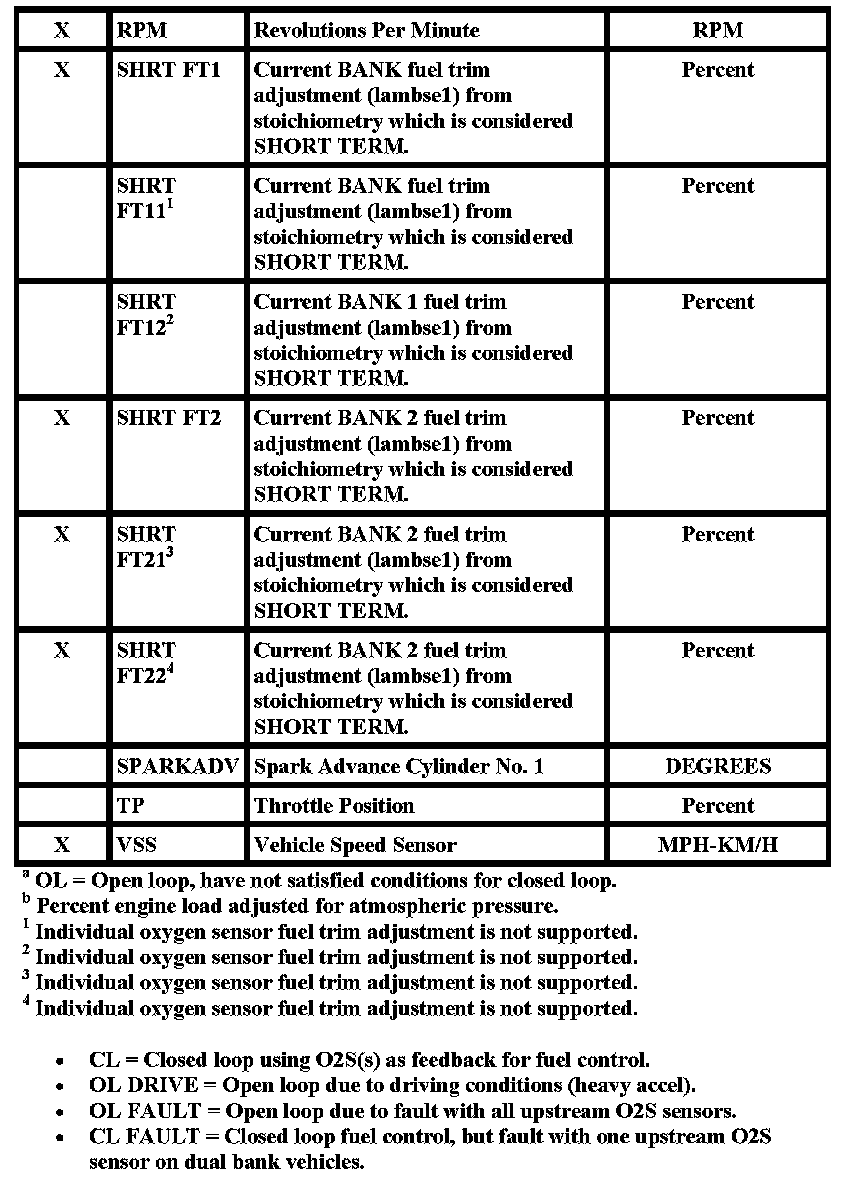"X" in the "Freeze Frame" column denotes both a mode 1 and mode 2 PID (real time and freeze frame).