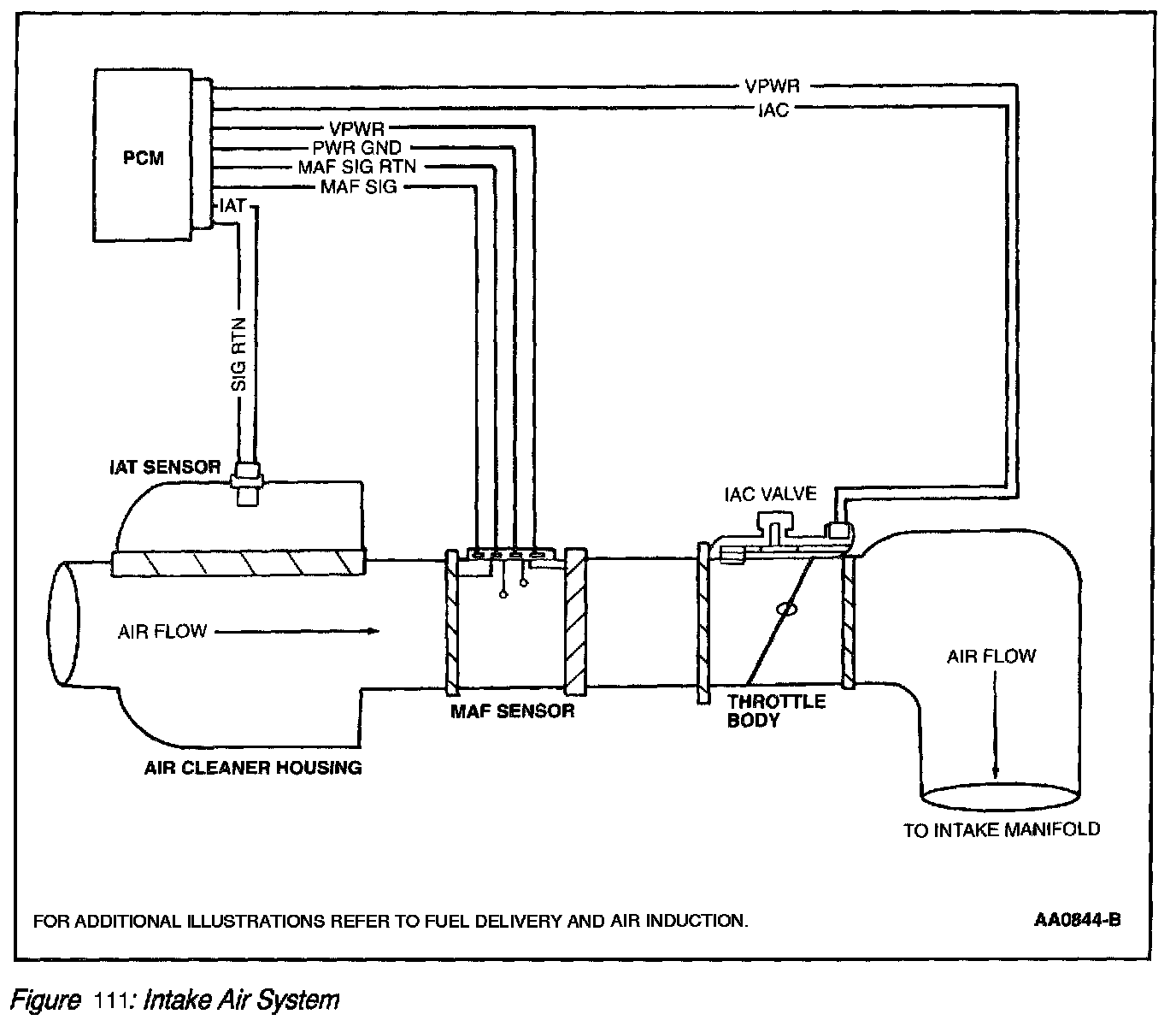 The Intake Air system provides clean air to the engine, optimizes air flow and reduces unwanted induction noise. The Intake Air System consists of an air cleaner assembly, resonator assemblies and hoses. The main component of the intake air system is the air cleaner assembly. The air cleaner assembly houses the air cleaner element that removes potential engine contaminants, particularly abrasive types. The Mass Air Flow (MAF) sensor is attached internally or externally to the air cleaner assembly and measures the quantity of air delivered to the engine combustion chamber. The MAF sensor can be serviced or replaced as an individual component. The intake air system also contains a sensor that measures the intake air temperature which may also be integrated with the MAF sensor. (Refer to Electronic EC Hardware - Powertrain Control Module (PCM) Inputs for additional information on the Mass Air Flow (MAF) and Intake Air Temperature (IAT) sensors.) Air induction resonators can be separate components or part of the intake air housing (i.e., conical air cleaner). The function of a resonator is to reduce induction noise. The air induction components are connected to each other and to the throttle body assembly with hoses.