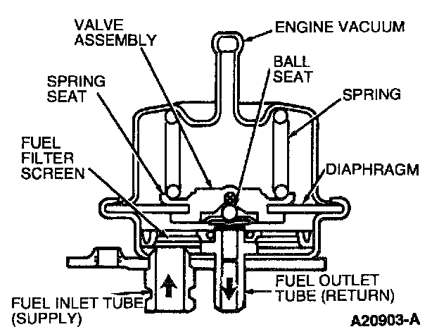 The fuel pressure regulator is attached to the fuel rail downstream of the fuel injectors. It regulates fuel pressure supplied to the fuel injectors. The regulator is a diaphragm-operated relief valve. One side of the diaphragm senses fuel pressure and the other side is connected to the intake manifold vacuum. Fuel pressure is established by a spring preload applied to the diaphragm. Balancing one side of the diaphragm with manifold vacuum maintains a constant fuel pressure drop across the fuel injectors. Fuel pressure is high when engine vacuum is low. Excess fuel is bypassed through the fuel pressure regulator and returned through the fuel return line to the fuel tank.