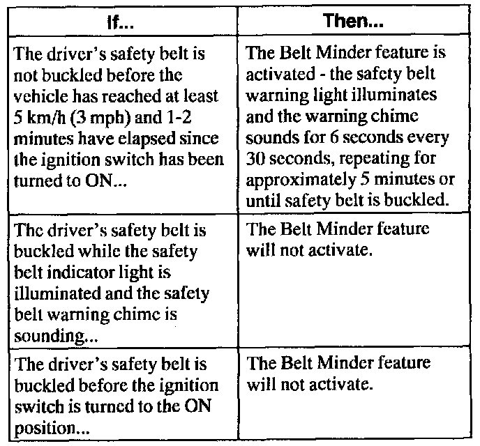 ^ If the safety belt is buckled before the ignition is turned to the ON position, neither the indicator nor the chime will turn on.