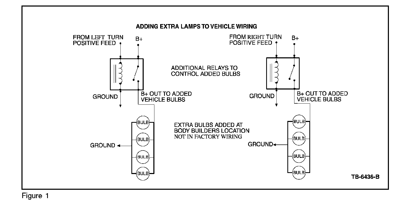 When adding additional bulbs to the turn signal or hazard flasher circuits, isolation relays must be used in order to prevent damage to the flasher relay module and/or the multi-function switch, and to prevent erratic operation.
