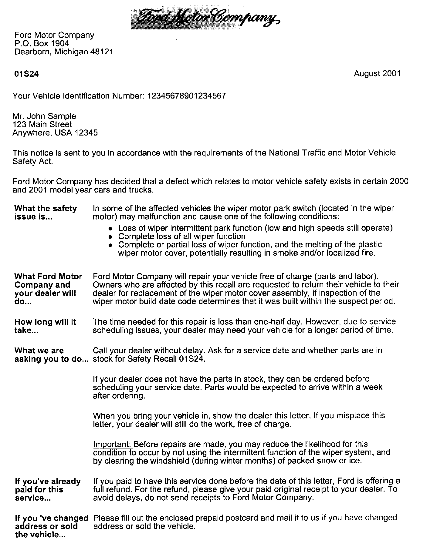 Recall - Defective Wiper Motor Switch/Gear Cover