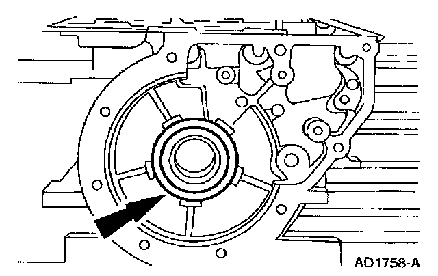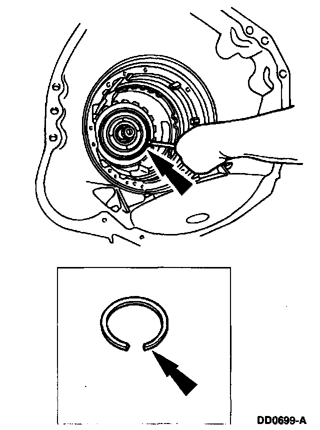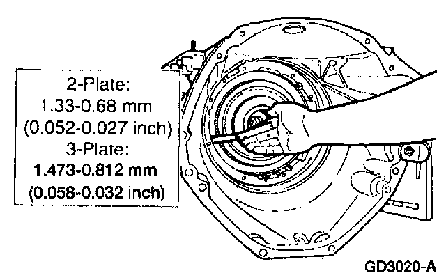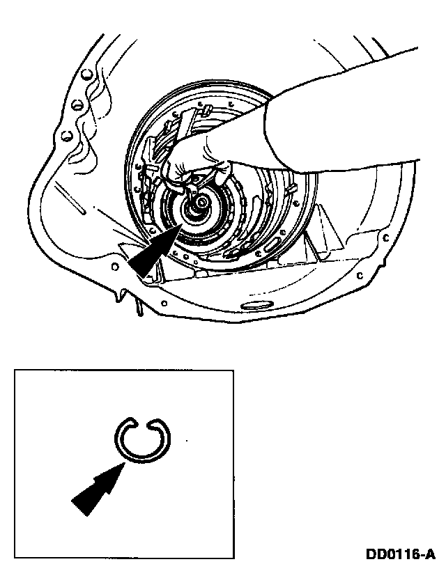 - If the clearance is not to specification, install the correct selective overdrive clutch pressure plate retainer snap ring and recheck the clearance.