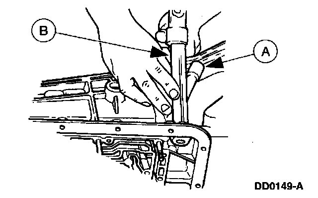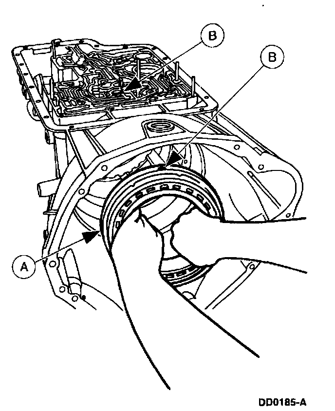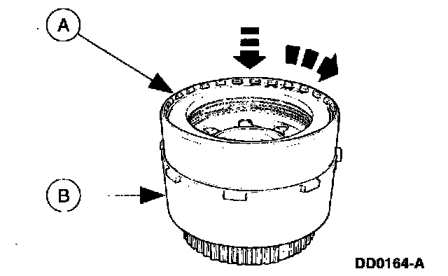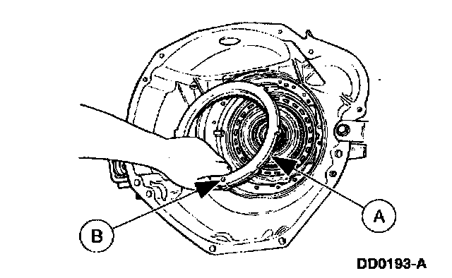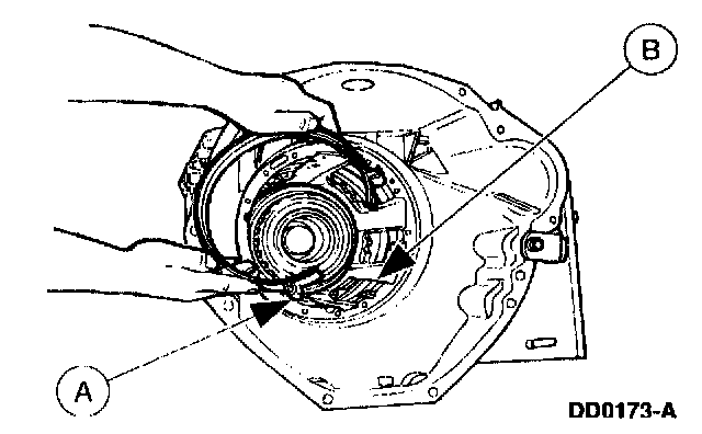 Position the (A) intermediate/overdrive cylinder retaining ring over the intermediate/overdrive cylinder with the (B) ring opening in the 6 o'clock position to allow proper fluid drainback.