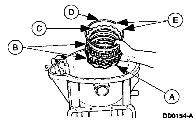 Install the (A) cushion spring; the (B) reverse clutch pack, starting with an external spline steel plate and alternating with internal splined friction plates; the (C) reverse clutch pressure plate; and the (D) reverse clutch pressure plate retainer snap ring, with the (E) ring opening between the 12 o'clock and 3 o'clock positions.