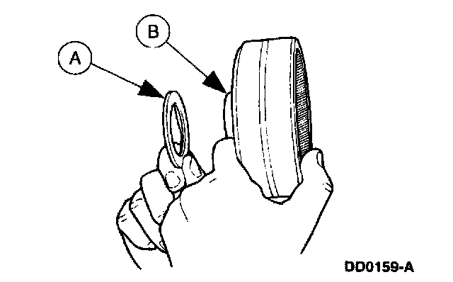 2. If removed, install the (A) short fluid inlet tube using the (B) Oil Filler Tube Replacer.