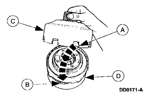 26. Align the (A) notch with the (B) lug and position the (C) input shell onto the (D) intermediate brake drum. Rotate the input shell until fully seated.