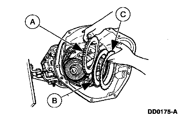 Install the (A) intermediate clutch pressure plate; the (B) intermediate clutch pack, starting with an internal spline plate and alternating with external spline plates; and the (C) intermediate clutch pressure apply plate, with blank area (no teeth) in the 6 o'clock and 12 o'clock positions.