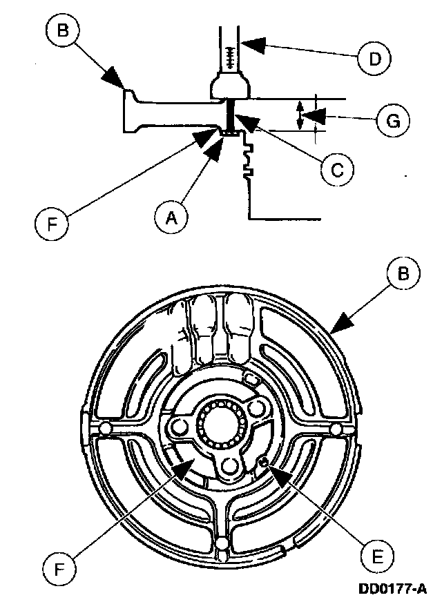 Hold the (A) thrust washer against the (B) center support assembly. Extend the (C) probe of the (D) Depth Micrometer into the (OD hole until flush with the (F) No. 6 center support thrust washer surface. Record this as (G) reading 1.