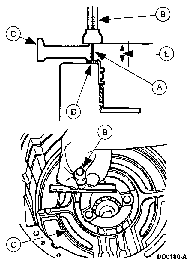 33. Extend the (A) probe of the (B) Depth Micrometer into the hole in the (C) center support assembly until flush with the (D) No. 6 center support thrust washer. Record this as (E) reading 2.