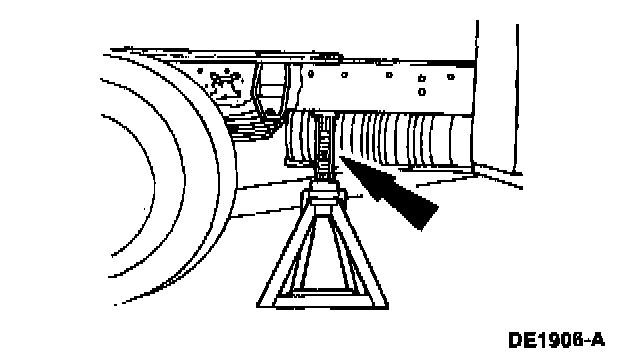 4. Raise and support the rear of the vehicle high enough so that it will clear the axle assembly when removing it.