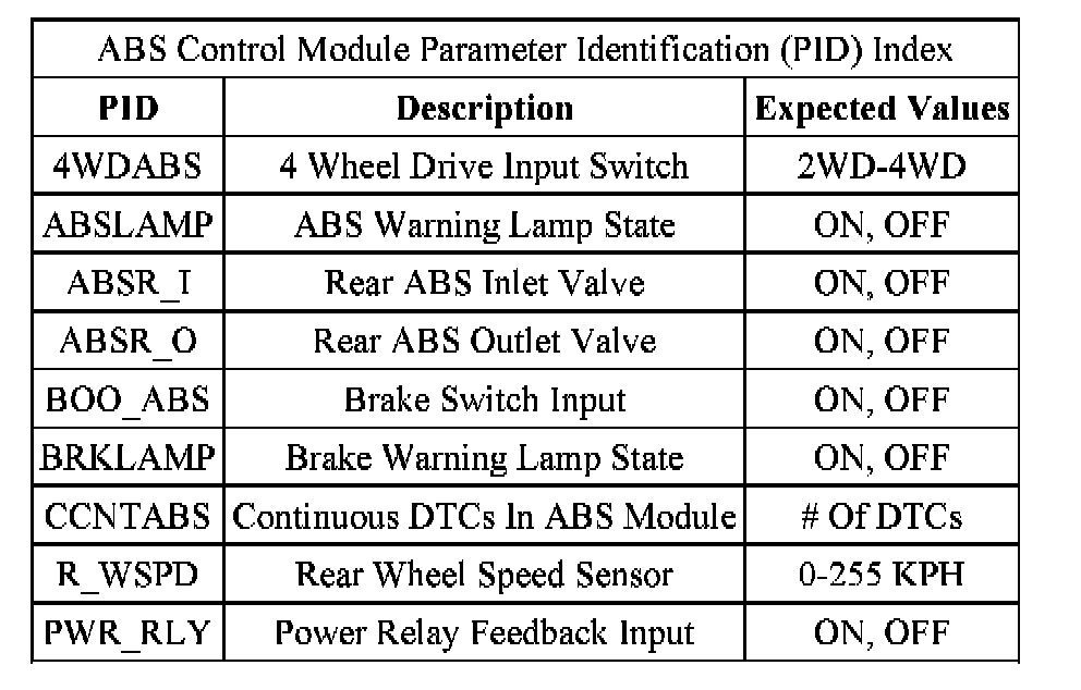 ABS Control Module Parameter Identification (PID) Index