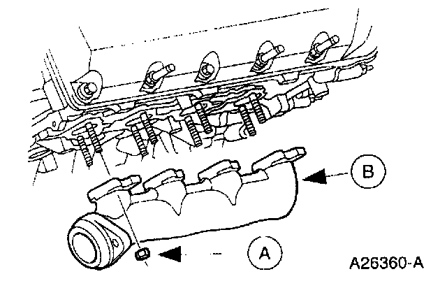 5. Remove the eight (A) nuts and the (B) exhaust manifold.