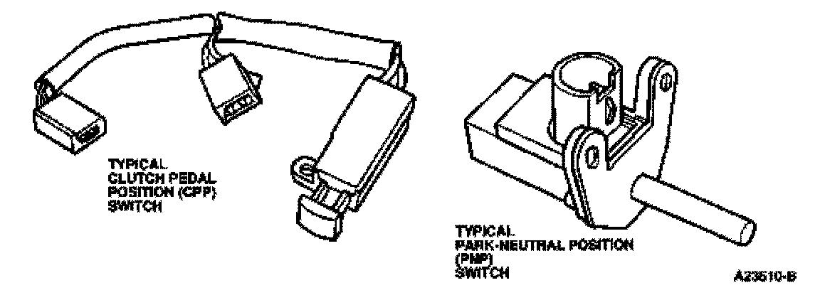 The clutch pedal position (CPP) switch (Figure 23) is an input to the PCM indicating the clutch pedal position and, in some manual transmission applications, both the clutch pedal engagement position and the gear shift position. The PCM provides a 5-volt reference (VREF) signal to the CPP switch and/or a park/neutral position (PNP) switch (on the CPP signal line). If the CPP switch (either or both CPP and PNP switches are closed) is closed, indicating the clutch pedal is engaged and the shift lever is in the NEUTRAL position, the output voltage (5 volts) from the PCM is grounded through the signal return line to the PCM, and there is 1 volt or less. One volt or less indicates there is a reduced load on the engine. If the CPP switch (or PNP switch on vehicle or both CPP and PNP switches open on the vehicle) is open, meaning the clutch pedal is disengaged (all systems) and the shift lever is not in NEUTRAL position (PNP switch systems), the input on the CPP signal to the PCM will be approximately 5 volts. Then, the 5-volt signal input at the PCM will indicate a load on the engine. The PCM uses the load information in mass air flow and fuel calculations.