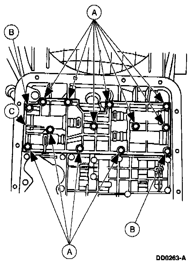 Remove the 20 (A) bolts, the (B) transmission fluid pan, and the (C) gasket.