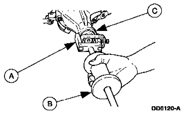 12. Remove the (A) bolts, the (B) nut, and the (C) solenoid body assembly, by pushing the solenoid body connector upward to help separate the assembly from the case bore.