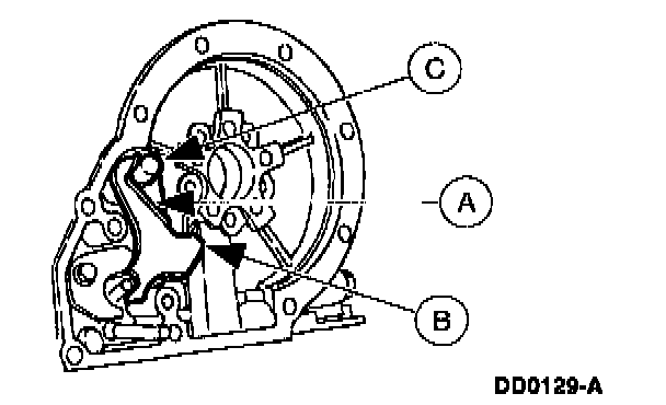 Remove the (A) nut, the (B) inner manual valve detent lever and the (C) parking pawl actuating rod.