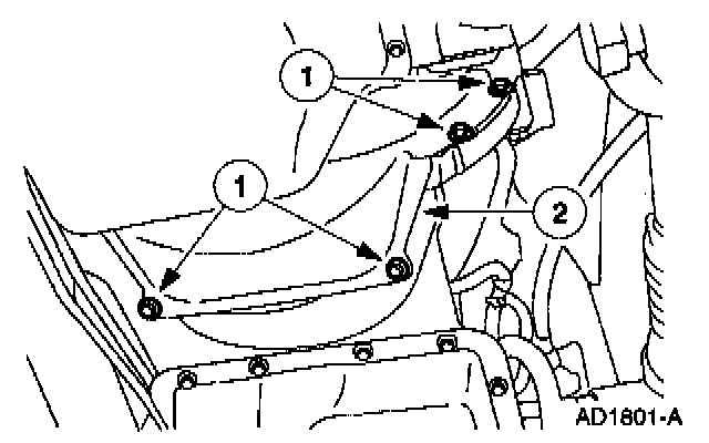 1. Remove the six transmission-to-engine (diesel) mounting bolts or seven transmission-to-engine (gasoline) mounting bolts.