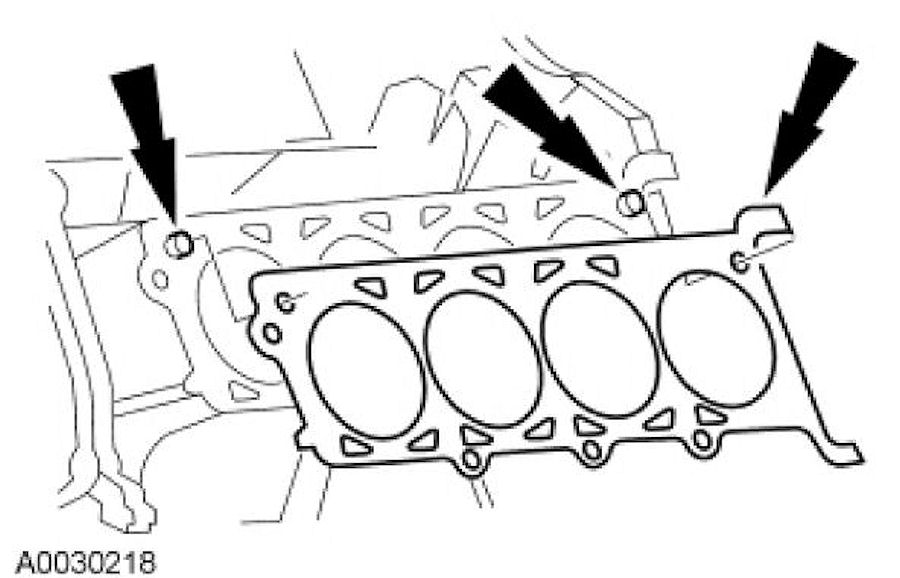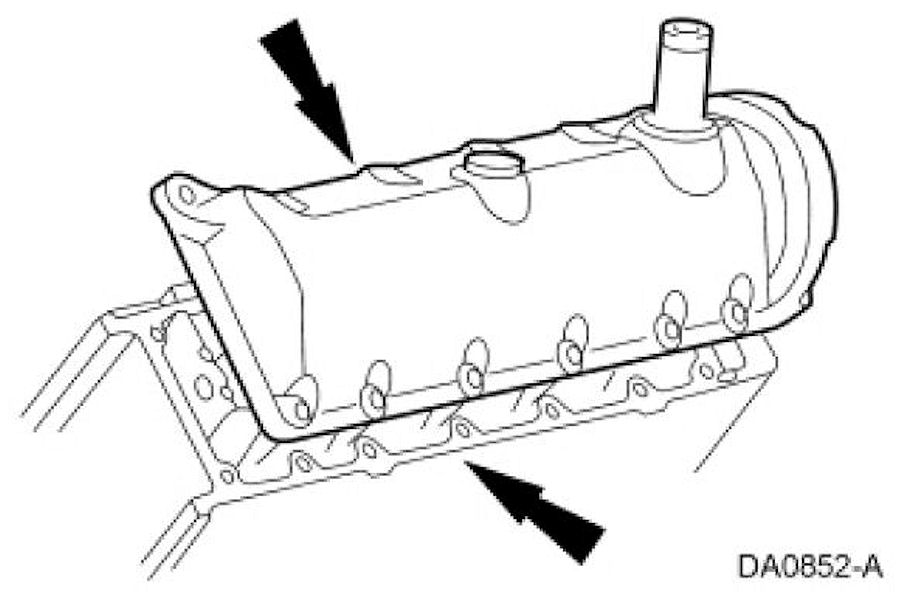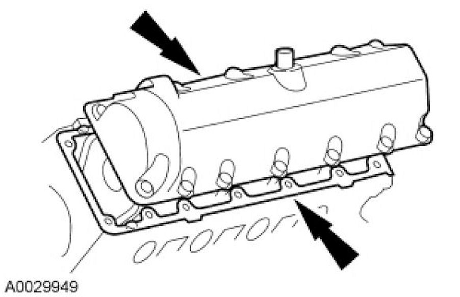 Apply a bead of silicone gasket and sealant along the cylinder head-to-cylinder block surface and the oil pan- to-cylinder block surface, at the locations shown.