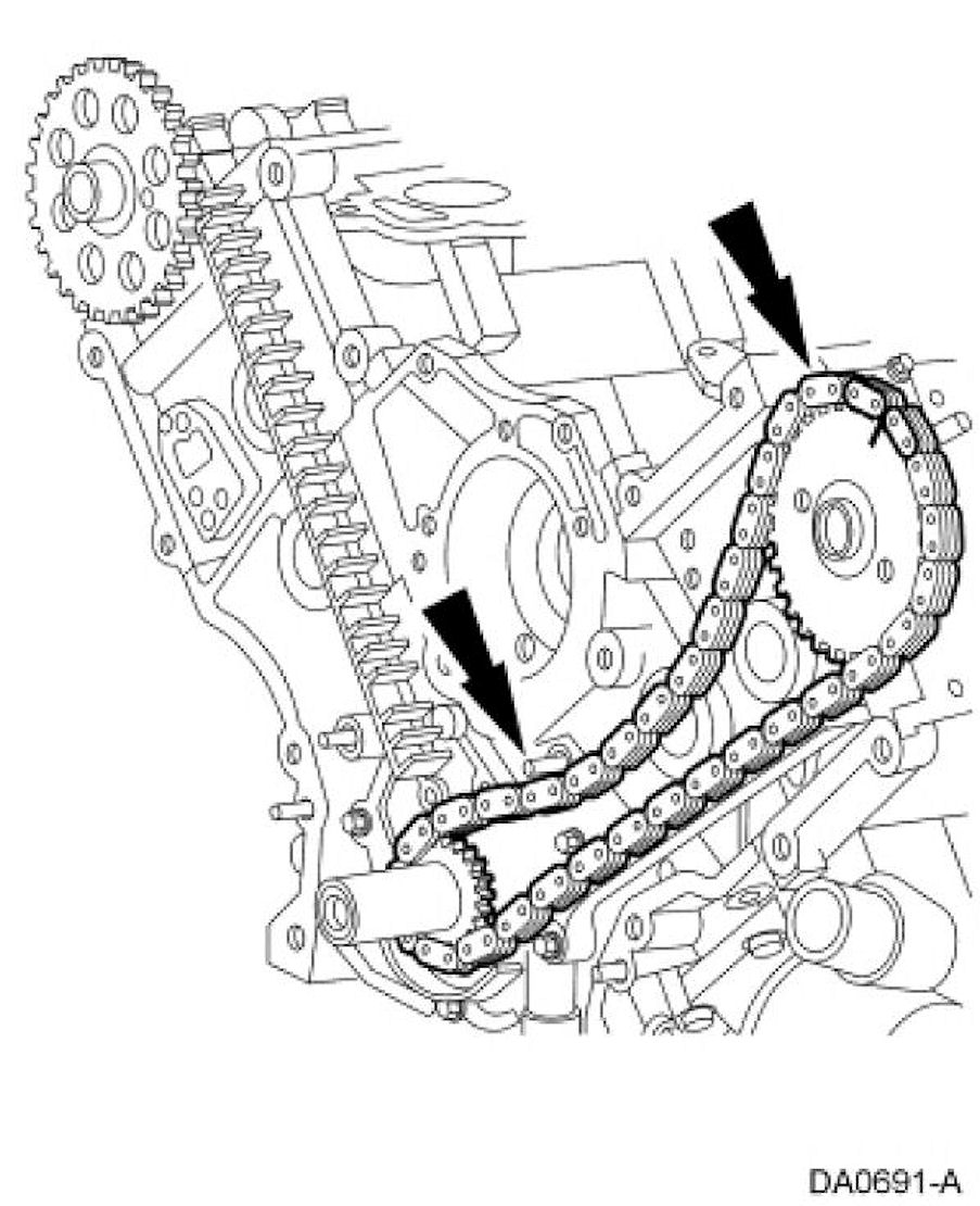 25. Position the lower end of the RH (outer) timing chain on the crankshaft sprocket, aligning the timing mark on the sprocket with the single copper (marked) chain link.
