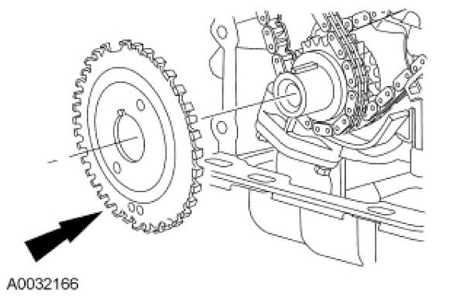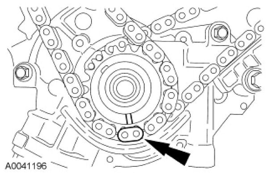 21. Position the lower end of the LH (inner) timing chain on the crankshaft sprocket, aligning the timing mark on the outer flange of the crankshaft sprocket with the single copper (marked) link on the chain.