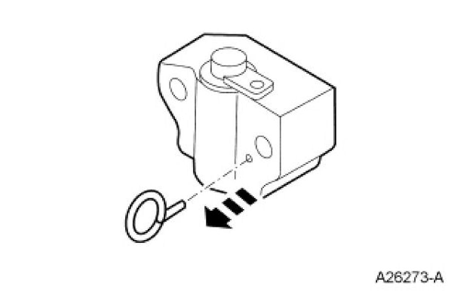 13. Install a paper clip into the hole in the tensioner housing to hold the ratchet assembly and plunger in during installation.