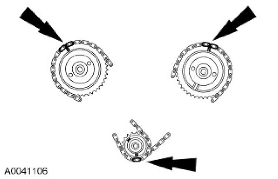 Position the RH timing chain on the camshaft sprocket. Make sure the camshaft sprocket timing mark is positioned between the two copper (marked) chain links.