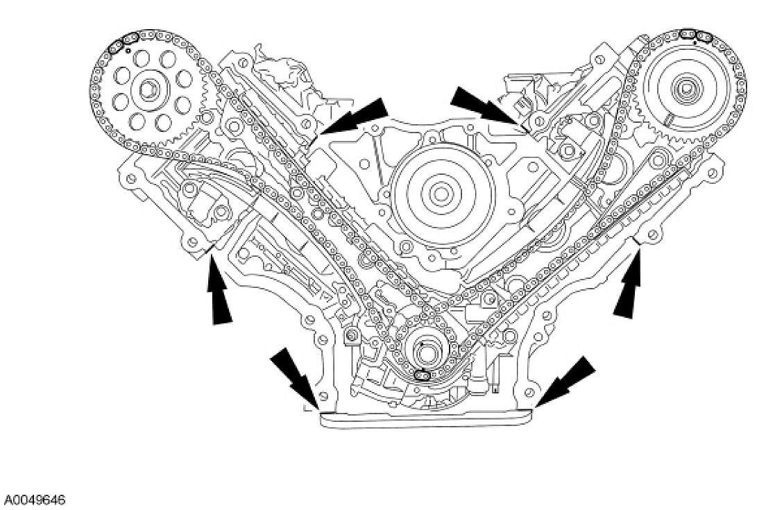 Apply silicone gasket and sealant in two places where the engine front cover meets the cylinder head.
